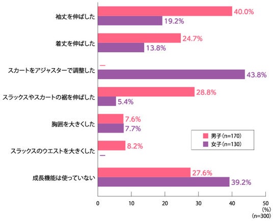 ●「袖丈を伸ばした」「着丈を伸ばした」「スラックスやスカートの裾を伸ばした」が多く、女子のスカートのアジャスター利用は4割を超える。一方で、「成長機能は使っていない」という回答が3~4割