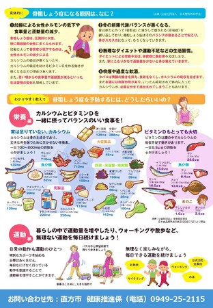 直方市は65歳以上の高齢者の割合が33.2%と全国の中でも高齢化が進んでいます。健康長寿を目指す直方市では、元気で長生きをするために高齢者ができる限りQOL(生活の質)の高い生活を送れるようにすることが重要な課題となっています。なかでも骨粗鬆症による骨折は、高齢者の寝たきりを招く主な原因の一つとなることから、その予防対策が必要になっています。正しい知識の普及を行い、骨粗しょう症検診で自身の骨に関心を持ってもらうことを目的としています。