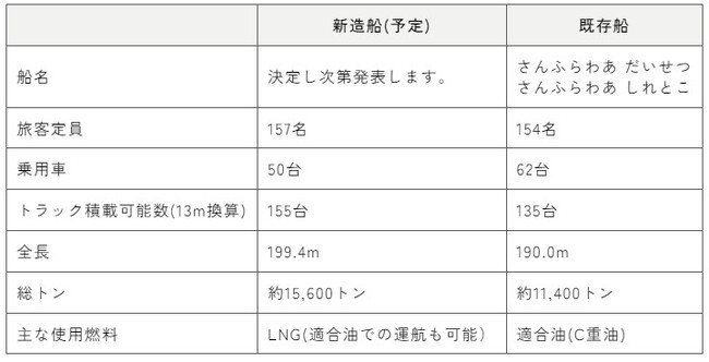 (註3) 代替対象である既存船「さんふらわあ だいせつ」、および「さんふらわあ しれとこ」と、本船の比較は下表をご覧ください。