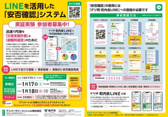 一般社団法人関西イノベーションセンター(所在地:大阪府大阪市中央区、理事長:早乙女 実、以下、MUIC Kansai)は、神戸市中央区(中央区長:増田 匡)及びアニバーサリーコンシェル株式会社(本社:高知県高知市、代表取締役社長:福島 元幸、以下、アニバーサリーコンシェル)と連携し、地域防災DXの推進を目的とした、LINEを活用した災害時における広域避難者の安否確認に関する実証実験を、神戸市中央区総合防災訓練内にて実施します。