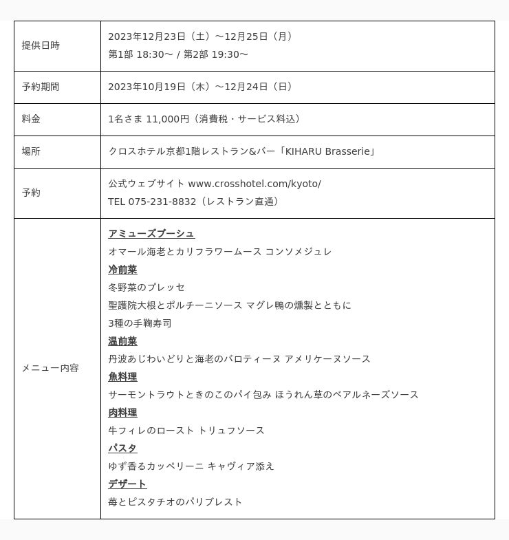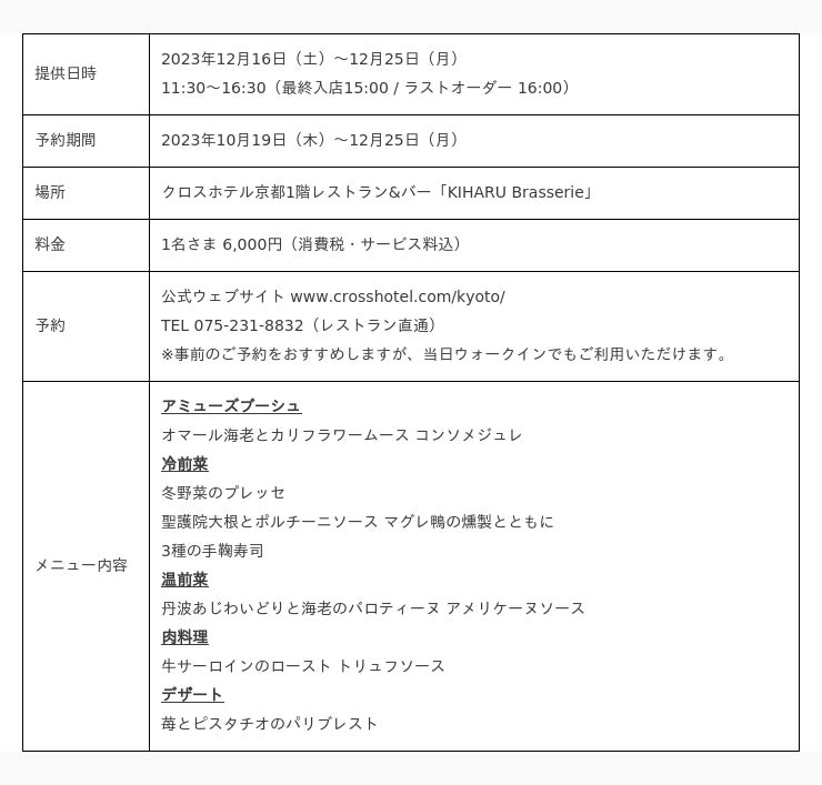 クロスホテル京都(所在地:京都府京都市中京区、総支配人:粂野隆史)のレストラン&バー「KIHARU Brasserie」では、クリスマスディナーを、2023年12月23日(土)~12月25日(月)の3日間限定で、クリスマスランチを2023年12月16日(土)~12月25日(月)の10日間限定でご提供します。また、いずれも本日よりご予約を開始します。