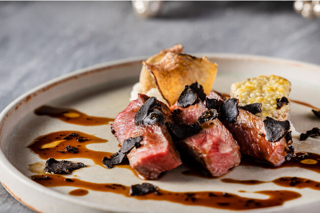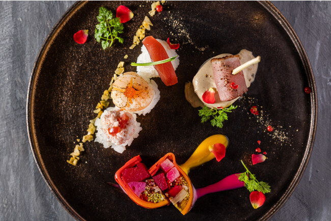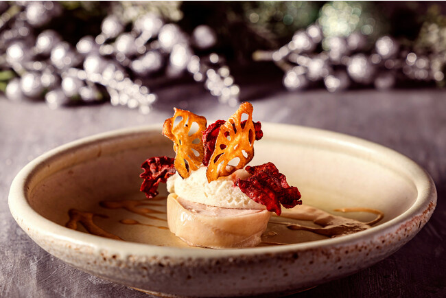 煌めくホリデーシーズンを飾るKIHARUのクリスマスメニューは「サステナブル クリスマス」をテーマに、環境負荷の軽減に配慮した食材や地域共創の観点から地産地消の食材を組み合わせました。ASC※1認証の海老と銘柄鶏・丹波あじわいどり※2を組み合わせたバロティーヌや、フォアグラ採取後の薫り高いマグレ鴨の燻製と京の伝統野菜・聖護院大根との一品、京都・亀岡産の希少な柚子のワタや種、皮、果汁まで丸ごと使ったアップサイクル商品「京柚」を使ったメニューなどを取り揃え、シェフだけでなく生産者の思いも詰まったコースに仕上げました。もちろん、クリスマスならではのオマール海老や牛フィレ肉、トリュフやキャヴィアなどの食材も使った華やかな料理が並びます。「食」を通しての貢献で、身も心も満たされるひとときをお過ごしください。