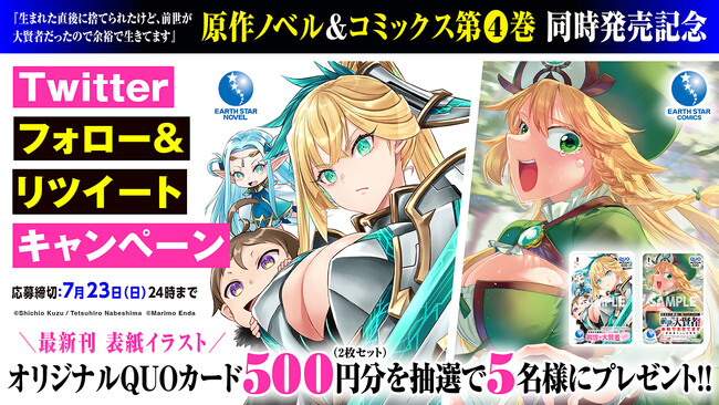株式会社アース・スター エンターテイメント(東京都・品川区)のコミックレーベル【アース・スター コミックス】とノベルレーベル【アース・スターノベル】では、現在『生まれた直後に捨てられたけど、前世が大賢者だったので余裕で生きてます』コミック4巻と原作ノベル4巻の同時発売を記念して、オリジナルQUOカードのプレゼントキャンペーンを開催中です。