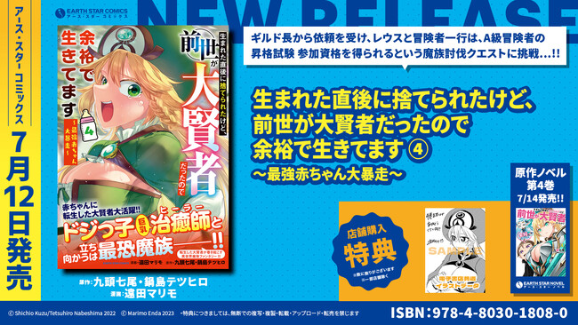 本日発売となった新刊コミック『生まれた直後に捨てられたけど、前世が大賢者だったので余裕で生きてます ~最強赤ちゃん大暴走~』第4巻。更に、明後日7月14日(金)に発売予定の新刊ノベル『生まれた直後に捨てられたけど、前世が大賢者だったので余裕で生きてます』第4巻の同時発売を記念して、コミックと原作ノベル最新刊の表紙イラストを使用した【オリジナルQUOカード2枚セット】を5名様にプレゼント!コミックの公式Twitterにてキャンペーンを実施中です。