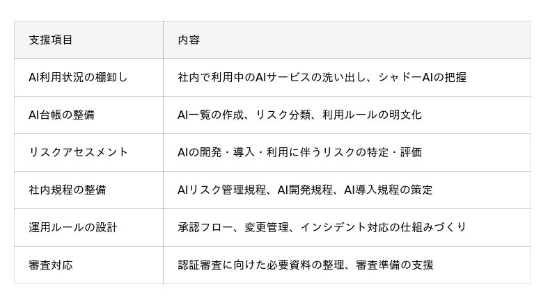 本認証は、社内規程の整備、AI利用状況の棚卸し、リスクアセスメントの実施など、企業が段階的にAIガバナンスを構築するための実務的な枠組みを提供します。