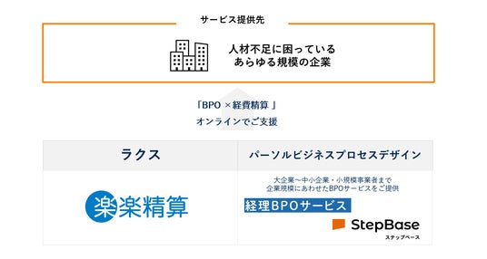 パーソルビジネスプロセスデザインが提供する中小企業向けBPOサービス「StepBase」において、ラクスの「楽楽精算」を組み込んだパッケージを新たに提供開始予定です。これによりクラウドシステム導入から業務設計、運用までをワンストップで支援し、中小企業でも短期間で経理DXを実現できる低コスト・スモールスタート型のBPaaSサービスの開発を進めてまいります。