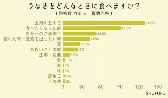 うなぎをどんなときに食べますか?(複数回答)の問いに対して最も多かったのが「土用の丑の日(64.5%)」でした。 次いで「食べたくなった時(45.5%)」「自分へのご褒美に(26.5%)」という結果でした。 「土用」とは季節の変わり目の期間で、「丑の日」は日にちを干支の順で数えた時の二番目の日ということのようです。そのため「土用の丑の日」は年に複数回ありますが、うなぎを食べる風習があるのは夏ですね。これはうなぎに夏バテ予防の栄養があるからだそうです。