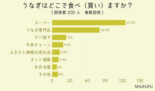 うなぎはどこで食べる(買う)かに関しては1位「スーパー(62.5%)」、2位「うなぎ専門店(40.5%)」でした。うなぎ専門店のうなぎが美味しいのは間違いないですが、スーパーでも美味しいうなぎが手頃な価格で売ってあり、わざわざ専門店に行かなくても手に入るのが便利ですね。