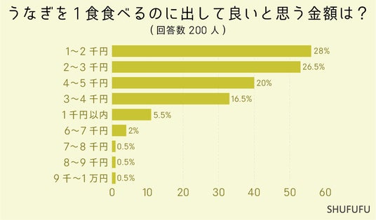 うなぎを1食食べるのに出して良いと思う金額を尋ねたところ、1位は「1~2千円(28.%)」、2位「2~3千円(26.5%)」となりました。うなぎ専門店だと少量サイズでも数千円以上するので、やはりスーパーのうなぎは手頃な値段で購入しやすいのかもしれませんね。