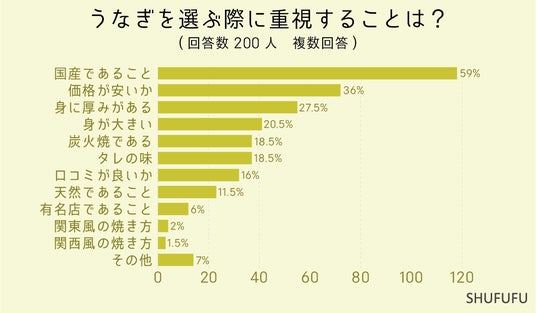 うなぎを選ぶ際に重視することを尋ねたところ、1位は「国産であること(59%)」、2位「価格が安いか(36%)」となりました。安いうなぎは中国産が多いのですが、中国産と国産ではうなぎの種類が異なるそうなので、国産の方がいいという方が多いのかもしれませんね。