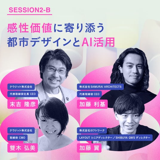感性価値に寄り添う都市デザインとAI活用都市の魅力を高める鍵となる「感性価値」に着目したAI活用による、新たな都市デザインの可能性とは?建築特化型画像生成AIを開発する株式会社SAMURAI ARCHITECTSの加藤利基氏、ソニーCSL 初のスピンアウト企業となるクウジット株式会社 代表の末吉 隆彦氏とCMO雙木 弘美氏が登壇し、議論します。