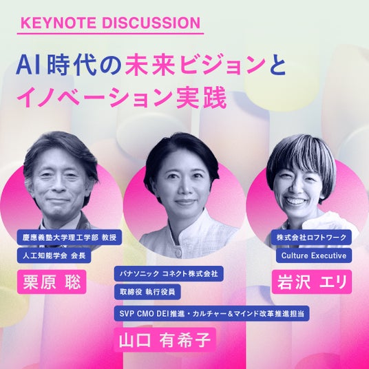 本イベントの2つのKEYNOTEでは、慶應義塾大学理工学部 教授であり、人工知能学会 会長を務める栗原聡氏と、パナソニック コネクト株式会社 取締役 執行役員 SVP CMO DEI推進・カルチャー&マインド改革推進担当 山口有希子氏をお迎えします。栗原氏は「人と共生できるAI」の研究を推進し、人工知能の自律性や人間との協調に関する深い知見をお持ちです。山口氏は、大手企業の中でも先駆的に全社で生成AI導入を実施し成果を上げているパナソニック コネクト社において、企業改革を担う立場にあります。マーケティング、デザイン、DEI、カルチャー変革などを横断する視点から、生成AI導入によって生まれた組織変化とその背景についてお話しいただきます。