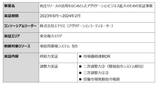 本実証事業の目的は、リソースアグリゲーターとしての家庭用蓄電池の制御精度の向上、及び、調整力・供給力提供サービスの拡充など家庭用蓄電池のアグリゲーションビジネスの実現可能性の検証です。