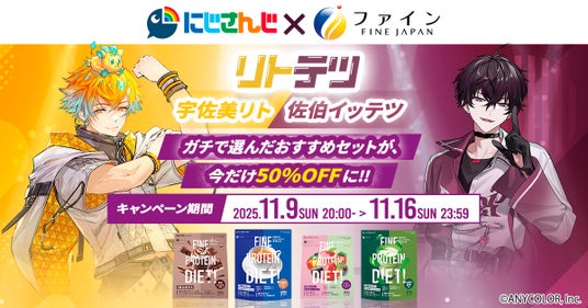 健康食品及び医薬品などを製造・販売する株式会社ファイン(本社:大阪市淀川区、代表取締役:佐々木 信綱)は、VTuber/バーチャルライバープロジェクトの「にじさんじ」に所属する宇佐美リトと佐伯イッテツとのコラボレーション「#にじファイン」を実施します。ファインプロテインダイエットとの初めてのコラボレーションを記念し、11月9日(日)20時~11月16日(日)23時59分までの期間限定で、リトテツ限定セットを発売します。