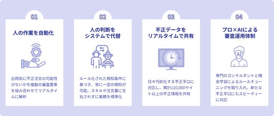 不正利用に対して迅速な対応を講じるため、まずはシステム開発不要のCSV連携で「O-PLUX」を導入しました。その後、システム開発が完了した段階で、運用の自動化と審査項目の追加によって、より高度な審査が実現できるAPI連携に切り替えました。これにより、迅速な不正被害対応とシステム開発期間中の対策が可能でした。