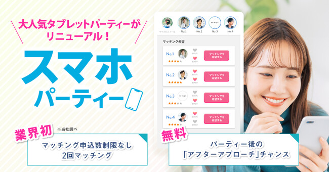 株式会社トータルマリアージュサポート(所在地:大阪市中央区 代表取締役社長:吉末育宏)が運営する婚活パーティーサービス「フィオーレパーティー」(サイトURL:https://www.fiore-party.com/)は、新たなサービスとして11月20日(月)より全国各地の個室会場で開催しているタブレットパーティーをスマホパーティーにリニューアル致します!
