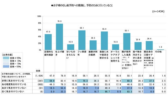 「非常に気をつけている」と答えた方の場合、予防のために行っていることで全体の平均と比べ差が大きかったのは「定期的な歯科検診」と「フッ素塗布」、「親が使用した食具(はし、スプーン、フォークなど)を使わせない」となりました。
