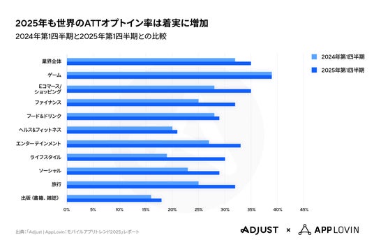 一方、App Tracking Transparency(ATT)オプトイン率は安定した増加傾向を示し、2025年第1四半期までに世界平均は32%から35%に上昇しています。特に、ゲームアプリのオプトイン率は39%と最も高く、Eコマースアプリとショッピングアプリも28%から35%へと大幅に増加しています。これは、ユーザーからの信頼が高まり、パーソナライズされた広告の価値が消費者に認識されていることを示しています。