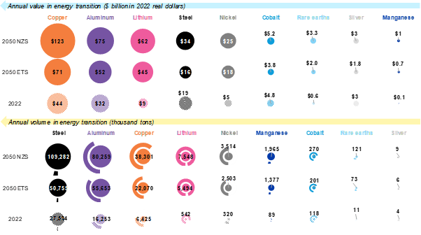 図1:エネルギー移行に伴う各種金属の需要推移(金額および量、2022年と2050年の比較)