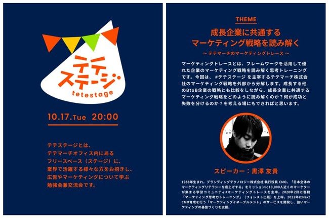 企業向けSNSマーケティング支援を中心としたビジネス展開をするテテマーチ株式会社(本社:目黒区、代表取締役:上田 大介)は、10,000人近くのマーケターが集まる学習コミュニティ「マーケティングトレース」で主宰を務める黒澤友貴氏をゲスト講師にお呼びして、10回目の開催となる勉強会兼交流会イベント「テテステージ」を実施しました。