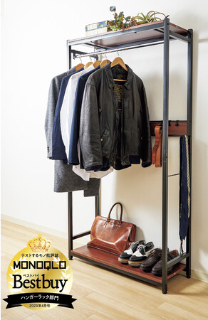 ヴィンテージっぽい雰囲気はもちろん、棚板がない分、丈が長い服でも使いやすい一台。パイプを前後に動かせるので袖が背面の板で曲がることがなく、キレイに見せつつ掛けられる優秀な一台です。