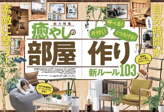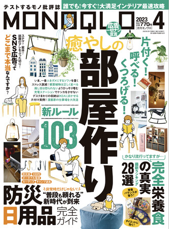 4月号は、“癒し”をテーマに、自宅を格上げしてくれる「癒しの部屋作り 新ルール103」を大特集。日々の生活感を隠してくれる引き出し付きローテーブルや、収納力バツグンのユニットシェルフ、くつろぎのリビングに欠かせないビーズソファなど、もっと住み良い自宅が実現するアイテムやワザをご紹介。そのほかにも、普段も使えて災害リスクにも備える「日用防災グッズ完全ガイド」、ヘアアレンジがビシッとキマる「ストレートアイロン人気10選」、毎日の健康維持をサポートしてくれる「完全栄養食ABC判定28製品」など、今欲しい情報満載でお届けしています。本リリースでは、編集部が“本当におすすめできる”製品の一部をご紹介します。