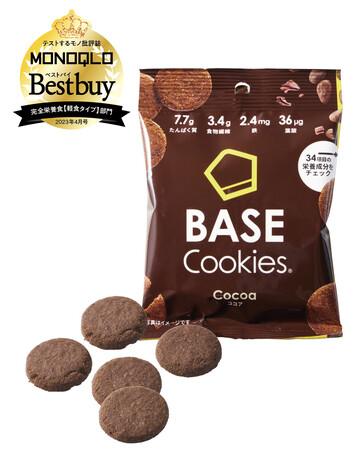 公式オンラインショップで買えるほか、コンビニやドラッグストアなどにも置いてあり、価格も安くて購入しやすいと高評価だった「BASE Cookies(R) ココア」。一般的なクッキーと比べると、甘さは控えめですが、サクサクとした噛みごたえが心地よく、様々な栄養素が配合されています。