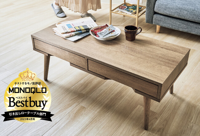 リビングに置きがちなリモコンやティッシュなどを中に収納できる引き出し付きテーブル。表面にプリントされたシートを貼っているので、本物の木目ではないものの、不自然さはありません。また、脚の木目との風合いの差がない点もデザイン的に優秀です。引き出しは2つついており、いずれもテーブルの幅いっぱいのサイズ感。引き出しの高さもあるので、いつもテーブルに出ているようなものをしまうぶんには十分な収納力です。