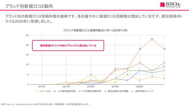 ブランド別の新規口コミ投稿件数の推移です。各社緩やかに新規口コミ投稿数は増加していますが、個別指導のトライは2020年に急増しました。