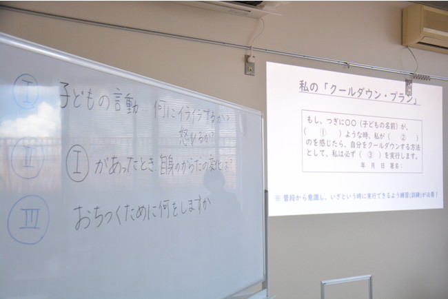 講座は、2人1組になり、子どもの問題行動を正すために「共感的介入」を意識しながら、親子で話す練習をしました。