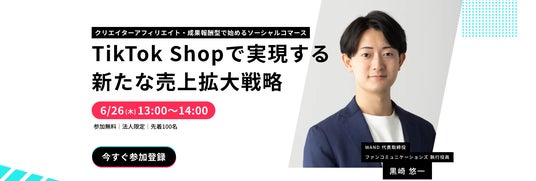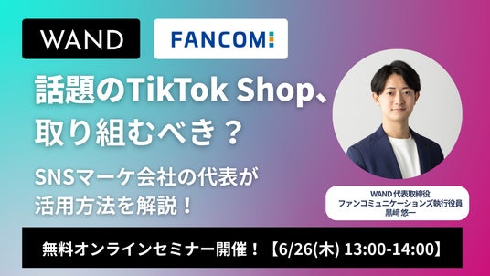 プロシューマー支援事業を展開する株式会社ファンコミュニケーションズ(本社:東京都渋谷区、代表取締役社長:二宮幸司 東京証券取引所プライム市場:2461)の連結子会社で、成果報酬型インフルエンサーマーケティングサービス「NOX」を始めとするフルファネル型ソーシャルメディアマーケティング支援を提供する株式会社WAND(本社:東京都渋谷区、代表取締役社長:黒崎悠一、以下「WAND」、会社HP:https://thewand.jp/)は、国内でのTikTok Shop本格展開に先駆けて、2025年6月26日(木)13時~14時にTikTok Shopを活用した売上拡大戦略を解説する無料オンラインセミナーを開催することをお知らせいたします。