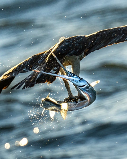 エピソード:ミサゴの狩りを狙っていると、すぐに真下の死角になる場所へ飛び込んだ! 目の前に現れたのは、大暴れするダツの姿でした。狙ってたミサゴよりダツが主役のシーンでした。