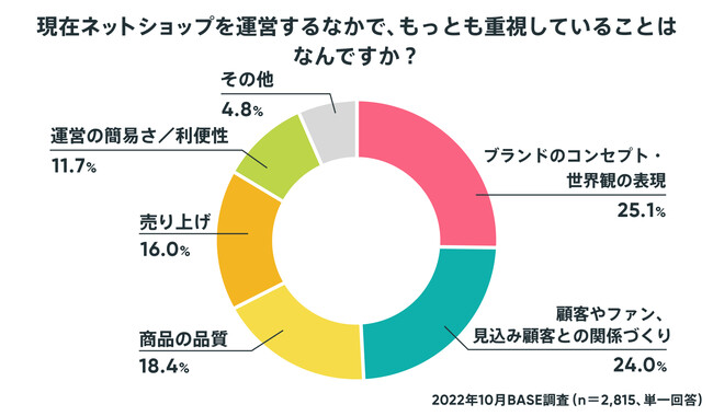 また、「現在ネットショップを運営するなかで、もっとも重視していることはなんですか?」の設問に対する回答は、2019年の調査開始から変わらず4年連続で1位が「ブランドコンセプト・世界観の表現」という結果になりました。自身のブランドや、自身の好みの価値観の表現を最も重要視するショップオーナーが最も多く、2位は僅差で「顧客やファン、見込み顧客との関係づくり」となり、近年注目されているCRM(Customer Relationship Management)も重要視していることがわかりました。