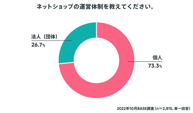 ネットショップの運営体制は、「個人」が73.3%、「法人」が26.7%と「個人」が7割を超える結果になりました。「法人」の利用割合は2年連続で増加しており、「個人」で運営していたネットショップが規模を拡大して法人化したことや、新型コロナウイルス感染症拡大の影響や新規事業の一環でネットショップを開設する法人が増え続けていると考えられます。また、2022年4月から、業界最安の手数料でネットショップを運営でき、売上規模が大きくなっても使いやすい「グロースプラン」を提供開始したことも法人利用増加の一因と考えられます。