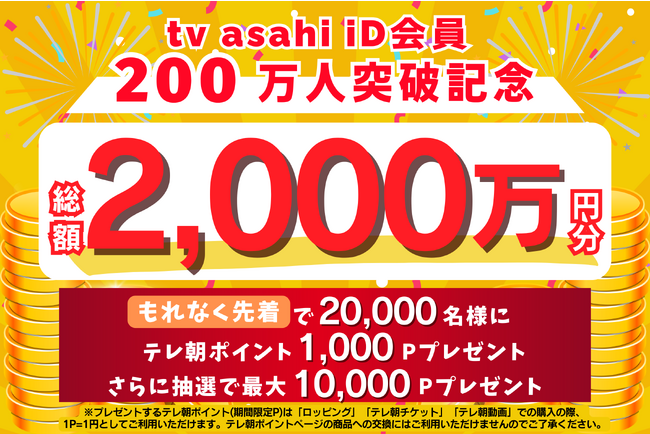 株式会社テレビ朝日(本社:東京都港区、代表取締役社長:篠塚 浩、以下 テレビ朝日)は、tv asahi iD会員200万人突破を記念し、総額2,000万円分の「テレ朝ポイント」プレゼントキャンペーンを2023年10月24日(火)17時より開始します。