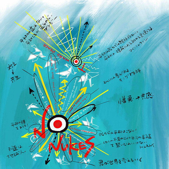 非人道的兵器である「核兵器廃絶 NO NUKES」のメッセージを中心に、平和に生涯を賭けた偉人たちの言葉をデザイン。