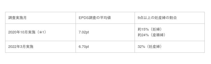 妊娠中・産後1年未満の女性を対象にEPDSを用いた調査を実施した結果、全体の3割が「うつ傾向が高い」とされる9点以上でした。回答者不一致のため一概には言えないが、前回調査(2020年10月)と比較した結果、EPDSの平均値はやや低下した一方で、9点以上だった妊産婦の割合は増える結果となりました。また、EPDS総合点の最大値は、前回調査より3点高い「29点」だった結果も踏まえ、新型コロナウイルス感染拡大から2年経過する現在も、産後うつのリスクは高い状況下にあり、妊産婦の孤立化が懸念されます。