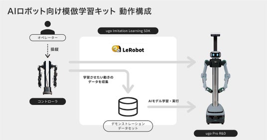 「AIロボット向け模倣学習キット」は、ugo Proをベースとしたデュアルアーム型のヒューマノイドロボット「ugo Pro R&Dモデル」や操縦者とロボットの間で動作と力覚を双方向に伝達し、直感的な操縦を実現するバイラテラルコントローラ、ugo Proの頭部にセットすることで人の視点を再現するヘッドマウントカメラ、そしてオープンソースの模倣学習フレームワーク「LeRobot」に対応したソフトウェアライブラリで構成された開発者向けパッケージです。