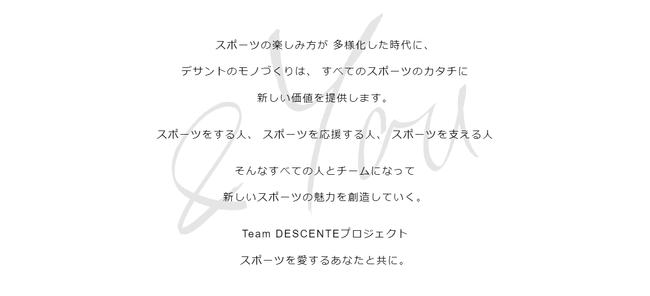 株式会社デサントは、企業理念「すべての人々に、スポーツを遊ぶ楽しさを」に基づき、当社が展開する各ブランドを代表するトップアスリートがアンバサダーとなり、お客様とつながるプロジェクト、“Team DESCENTE(チームデサント)”プロジェクトを2020年より展開しています。これは、当社が展開する全ブランドが一丸となり、スポーツを深く理解しているデサントならではの独自のアプローチで、ステークホルダーの皆様と共に、新しいスポーツの魅力を創造していくものです。(https://www.descente.co.jp/team_descente/index.html)