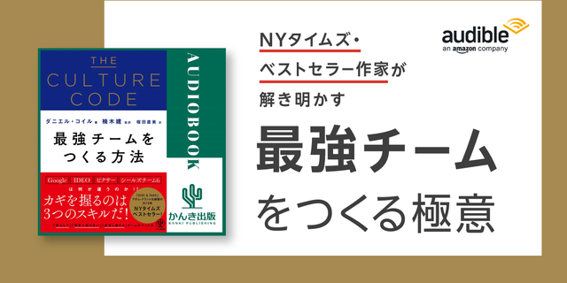 Amazonオーディブル (以下、Audible) は、「THE CULTURE CODE 最強チームをつくる方法」(ダニエル・コイル/著 楠木建/監訳 桜田直美/訳、かんき出版)のAudible版を、2022年9月30日(金)より聴き放題対象作品として配信開始することをお知らせします。