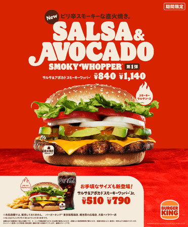 さらに、コクのあるチェダーチーズ、フレッシュなレタス、トマト、オニオン、ピクルスと豊富な野菜を合わせ、トーストしたセサミバンズでサンドしました。ピリ辛で香ばしい新開発「スモーキーサルサソース」が直火焼きの100%ビーフパティの旨みを引き立て、クリーミーなアボカドや豊富な野菜とも相性抜群の、初夏にぴったりな期間限定商品です。また、お手頃サイズの『サルサ&アボカド スモーキーワッパー(R) Jr.』もご用意しております。お好みに合わせてお楽しみください。