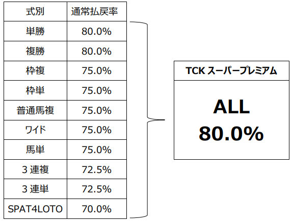 東京シティ競馬(TCK)では、お客様の日頃のご愛顧に感謝し、年末開催の12月27日(水)にて、当日の全レース・全式別の勝馬投票券払戻率を80%に設定する「TCKスーパープレミアム」を実施しますので、お知らせいたします。