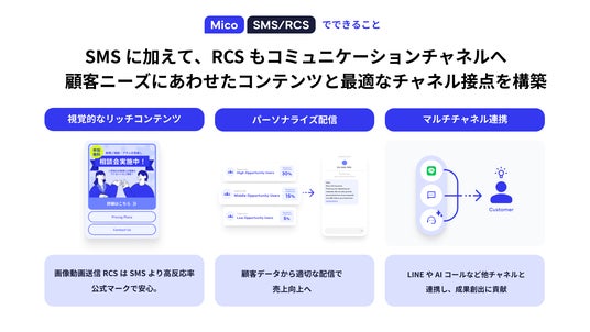 株式会社Mico(本社:大阪市北区、代表取締役社長:山田 修)は、企業と顧客との間で「届く、伝わる」コミュニケーションを促進するため、「Mico SMS/RCS」のサービス提供を開始しました。