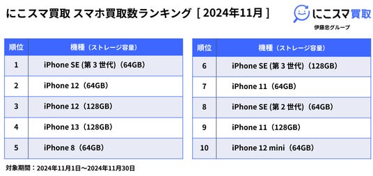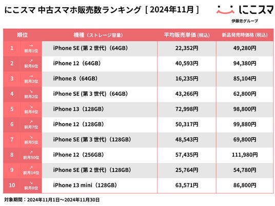 2024年11月の販売数ランキングでは、iPhone SE(第2世代)が12ヶ月連続で1位にランクインしました。