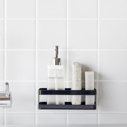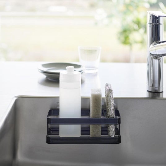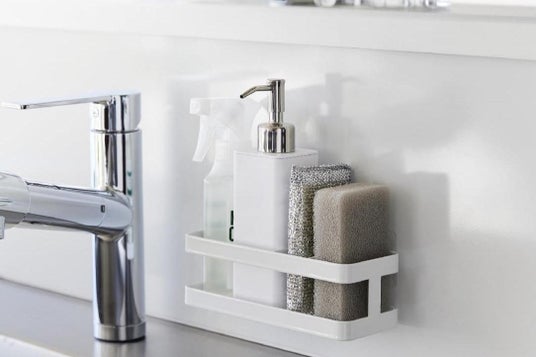 フィルムフックで浮かせて収納できるスポンジ&ボトルラック。