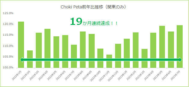 美容室チェーンを300店舗以上展開する株式会社アルテ サロン ホールディングス(横浜市中区/代表取締役社長 吉村 栄義)のグループ会社である株式会社 C&P(横浜市中区/代表取締役社長 吉村 栄義)が展開するカット&カラー専門店「チョキペタ」は、2021年より19か月連続で前年同月売上を更新し、2022年12月末には17億円を突破しました(※)。新型コロナウイルス感染拡大による緊急事態宣言に伴い、2020年は大多数の店舗で約1ヶ月休業するなど影響を受けたものの、コロナ禍で買い物ついでに予約なし・短時間で立ち寄ることができるメンテナンス美容室の便利さが新規層にも広がったことが売上が伸びた要因です。その他、LINE会員の獲得強化(2年半で約9万人増)やセグメント配信の奏功、また、物販(ドライヤー)の販売好調もあり、2023年5月に月間売上の過去最高MAXを更新しました。