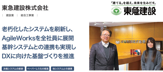 業務手続きの電子化(ワークフローシステム)大手の株式会社エイトレッド(本社:東京都渋谷区、代表取締役社長:岡本 康広 以下、エイトレッド)が提供するワークフローシステム「AgileWorks(アジャイルワークス)」をご利用いただいている、東急建設株式会社(本社:東京都渋谷区、代表取締役社長:寺田 光宏 以下、東急建設)の導入事例を公開いたしました。