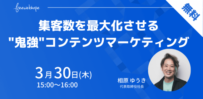 株式会社free web hope(本社:東京都中央区、代表取締役:相原ゆうき)は、無料のオンラインセミナー「集客数を最大化させる"鬼強"コンテンツマーケティング」を3月30日(木)に開催いたします。(お申込みフォーム:https://share.hsforms.com/1GUcUZL7RTAygLe3If_yQhA5fwo5)