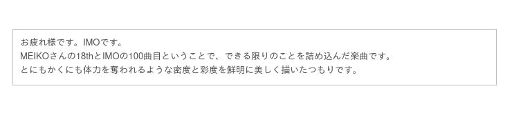 ■クリエイター:IMO / ボーカル:MEIKO、KAITO、初音ミク、鏡音リン、鏡音レン、巡音ルカ