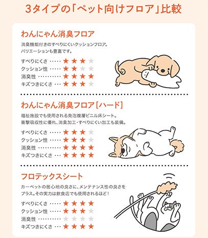 近年、ペットを大切な家族の一員として考え、その快適な暮らしや健康をサポートするサービス・アイテムを求める需要が高まっています※。当社はこのニーズに対応し、人にもペットにも心地よい空間をつくる床材を「ペット向けフロア」シリーズとして刷新しました。ペットに最適な特長を持つ商品を、機能や素材による3タイプに分けて収録した、計35点のラインアップです。